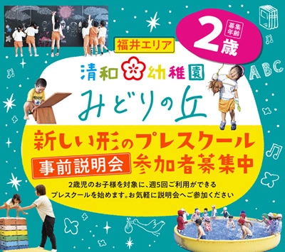 清和幼稚園みどりの丘では、新しい形のプレスクールをスタートします。2歳児のお子様を対象に、週5回ご利用できるプレスクールです。