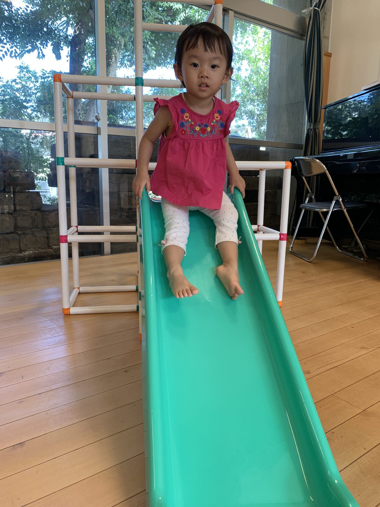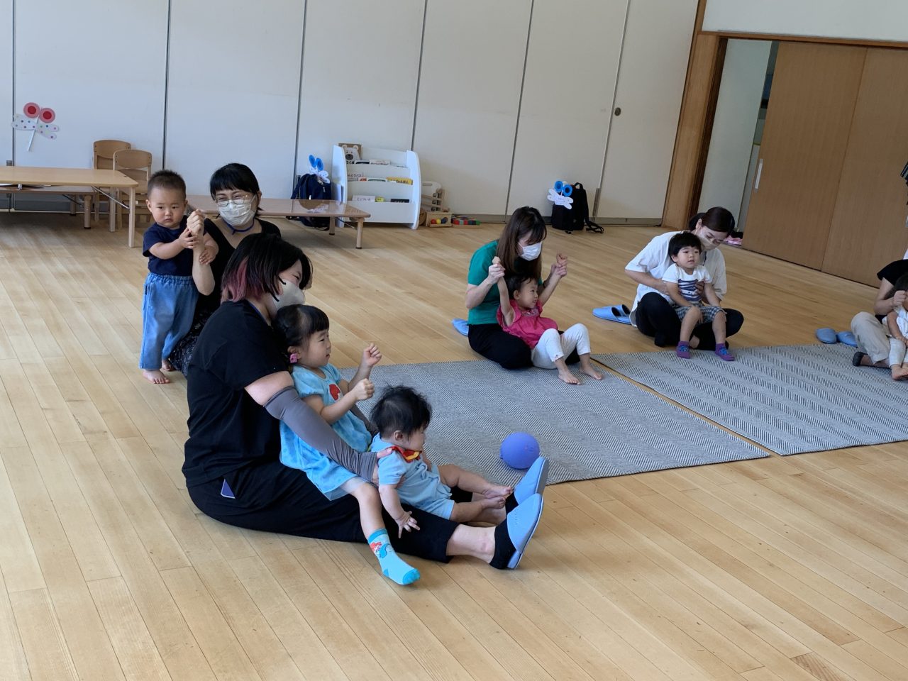 リズム遊びは『バスにのって』の親子でふれあい遊びを楽しみ、カーブで体を横に倒す場面やガタガタ道でくすぐられる場面では、思わず「キャハっ♪」と声が出る程笑顔で楽しむ姿が見られていました。
