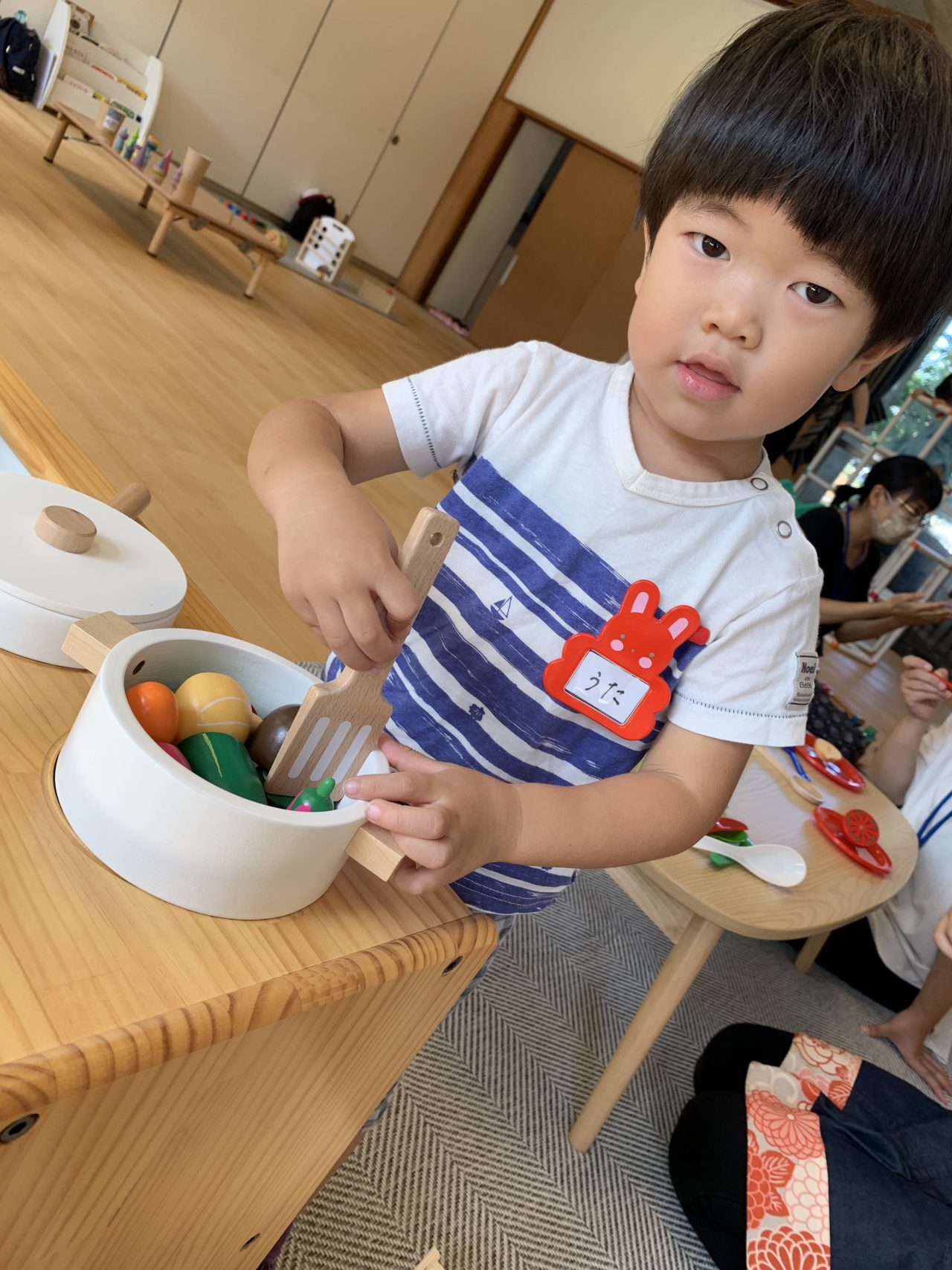 ままごと遊びでは、食材を包丁で切ってみたり、調味料を振って料理作りを楽しんだりとご家庭でお家の方の姿を見て真似ようとする姿や、お手伝いをしているエピソードも聞くことができてとても微笑ましく感じました。