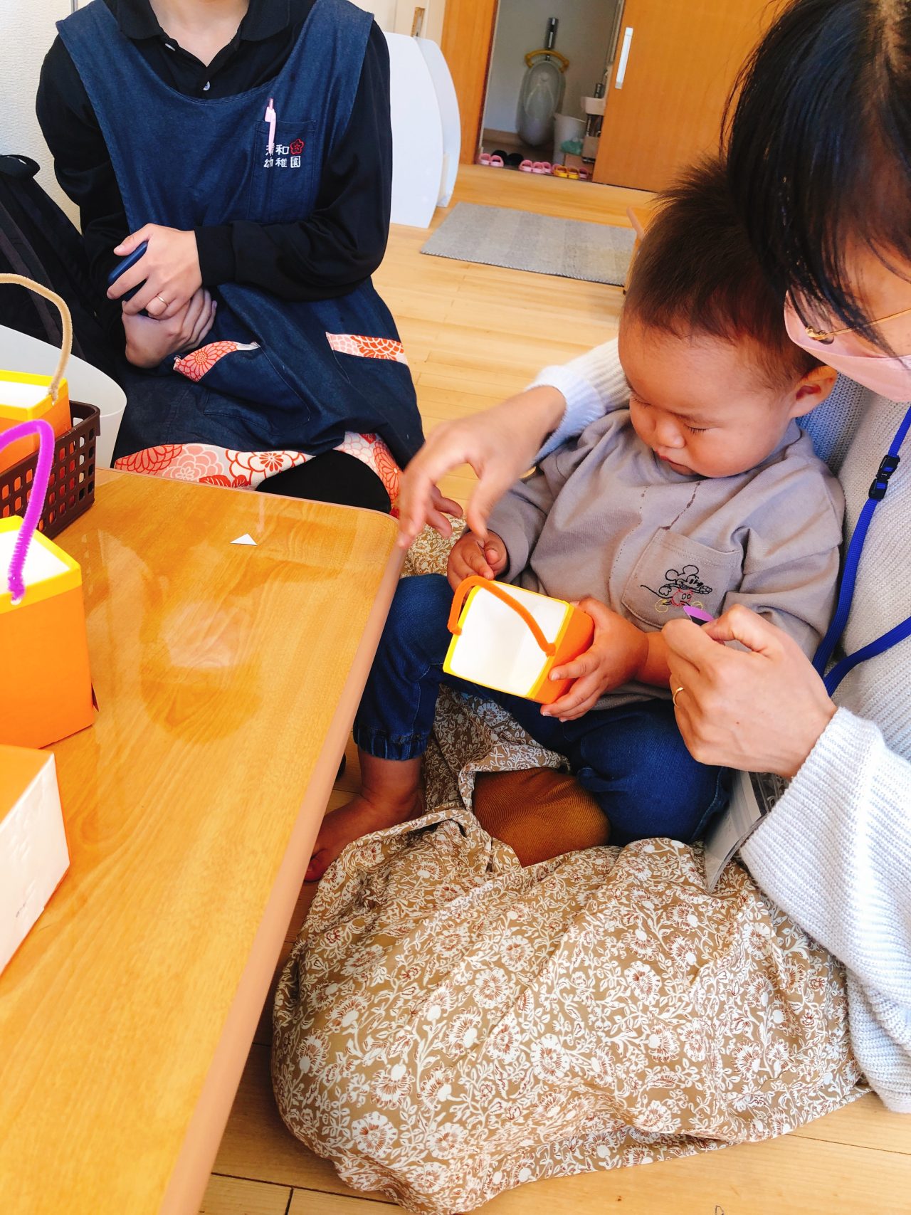 オレンジの画用紙を貼った牛乳パックに、目や口、帽子などを「ここかな~♪」と考えることも楽しみながら作りましたよ(^^)