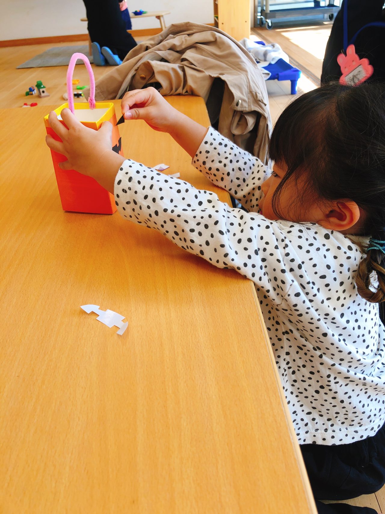 貼る位置によって表情もさまざまで、「もう1つ作る!」と2つめを作ったり、妹さんの分まで作ってあげようとする姿も見られ、とても微笑ましく感じました(*^^*)