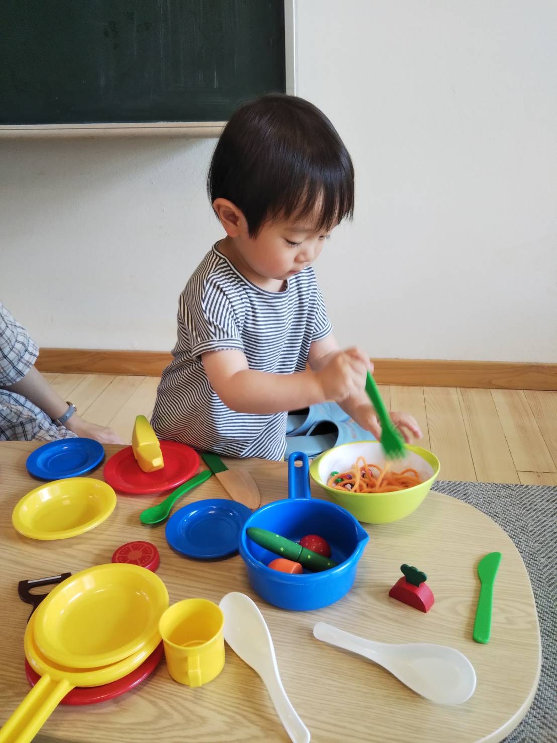 Tシャツの形に切った画用紙に、青、オレンジ、ピンクの色を使ってポンポンっとスタンプしました!! 丸い形や、押し方によっては扇形にようにもなっていて、それぞれの素敵なTシャツが出来ていました! その他にも大人気のいちごのシール貼りや、あおむしの製作を楽しむお友だちもいましたよ。 また、おままごとでは、美味しそうなご馳走を作ったり、お友だちに道具をどうぞと渡してあげたりする様子なども
