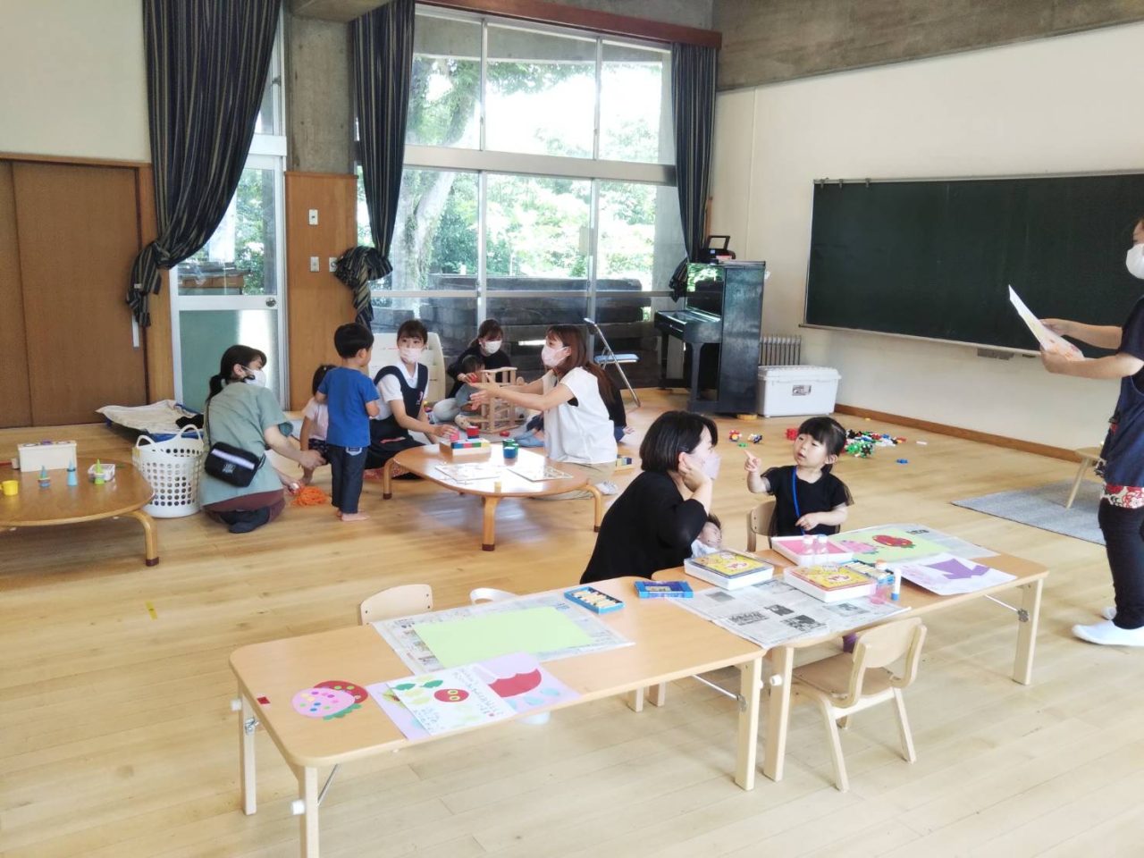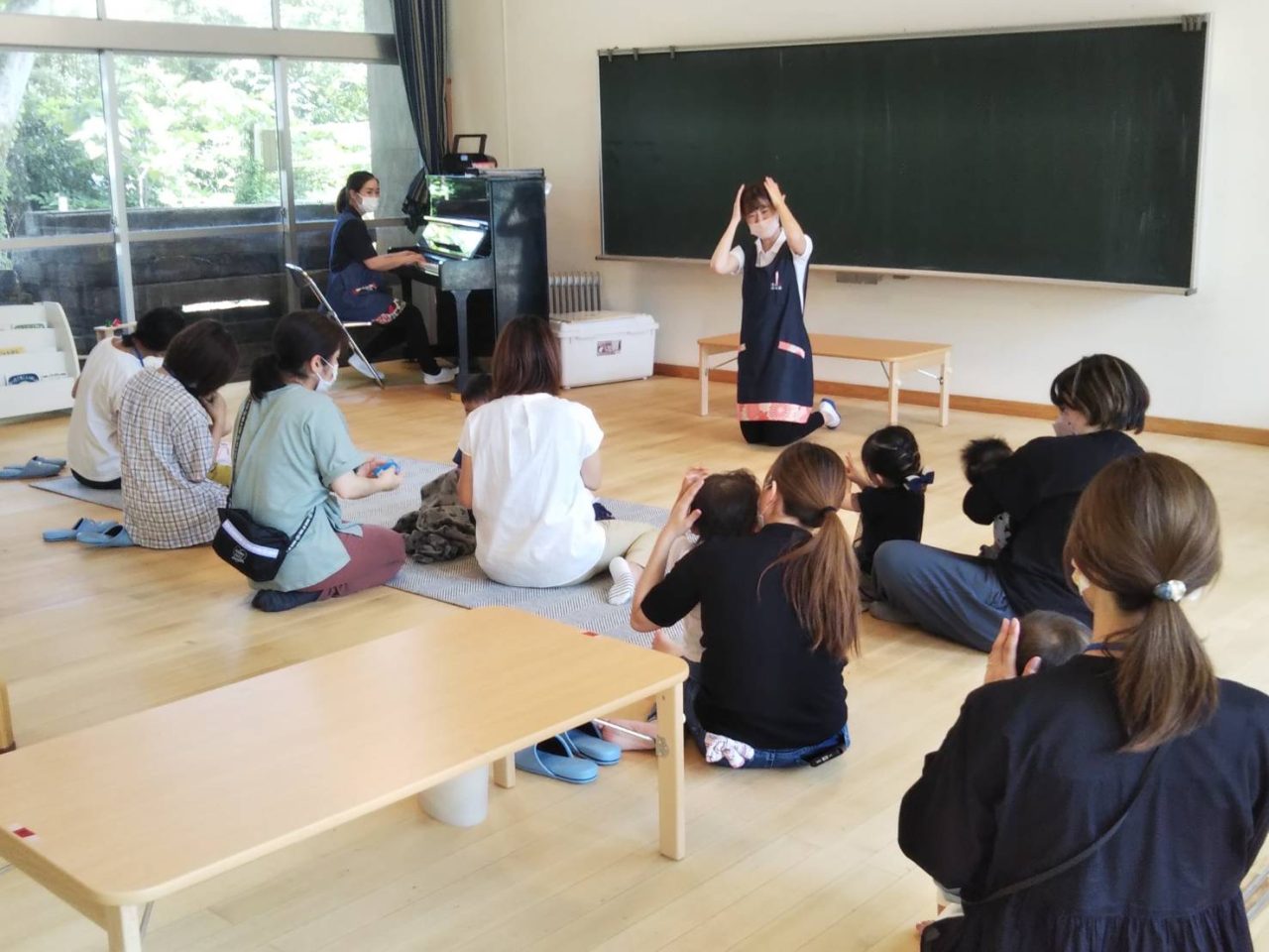見られていました。 ブロックやスロープのおもちゃも大人気でじっくり集中して楽しむお友だちもいました! それぞれの遊びを先生やお家の方と一緒に楽しむ姿が見られていましたよ。 みんなで集まって手遊びやお歌、リズム遊びも行いました。【アンパンマン】や【むすんでひらいて】の