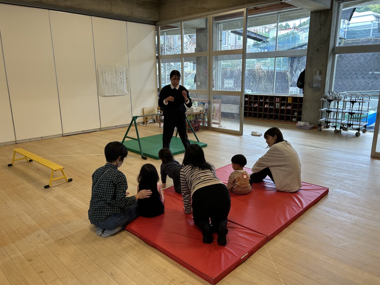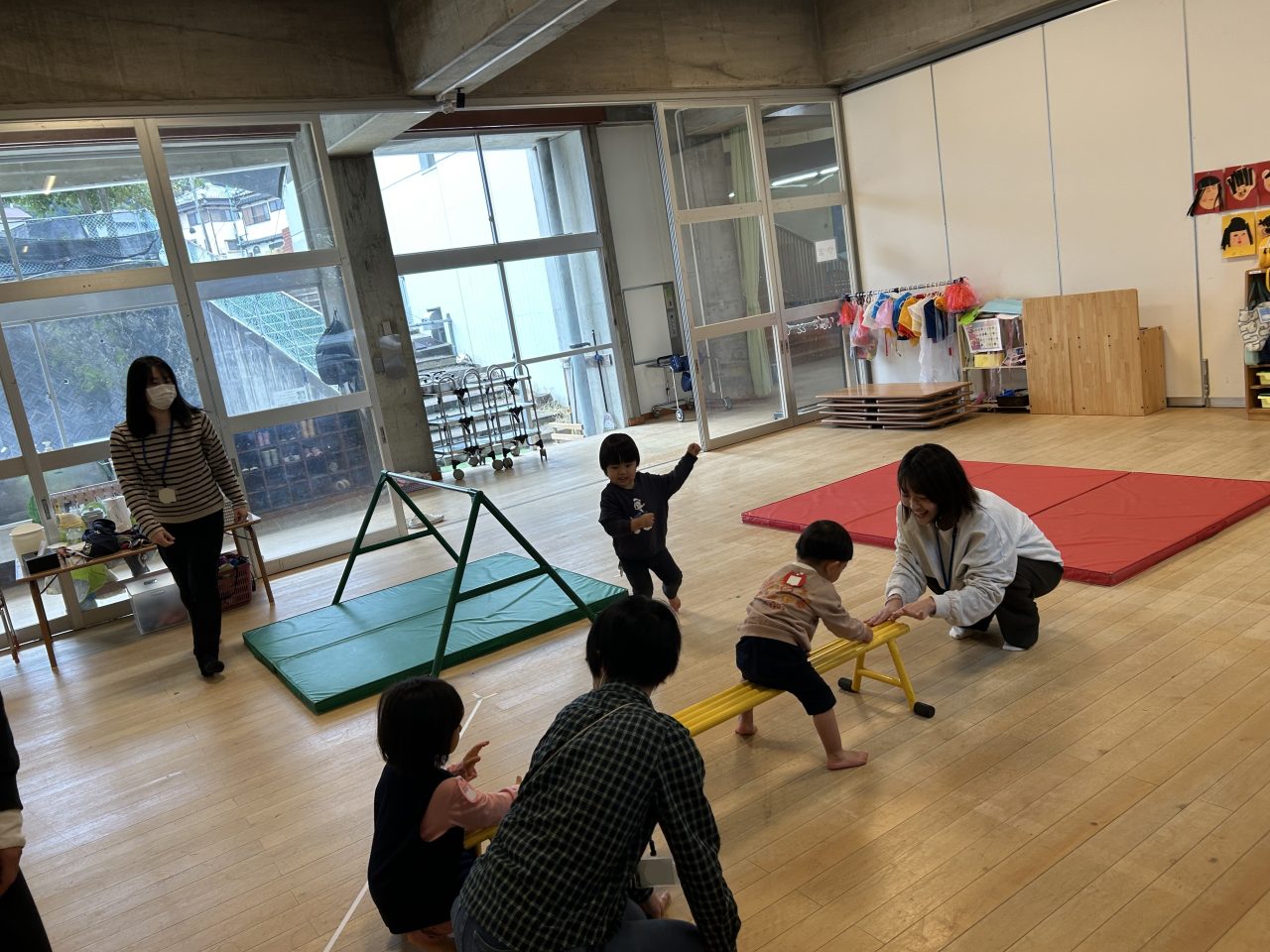 「平均台では、またがって、手をついて進んでみよう!」と先生が見本を見せてくれると上手に真似ていました。