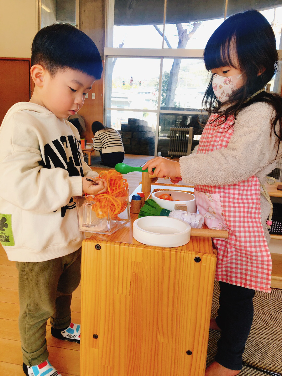 お兄さんお姉さんのお友だちは、ごっこ遊びが大盛り上がり!エプロンをつけてお料理を作ったり、ご馳走を食べたりしていましたよ。