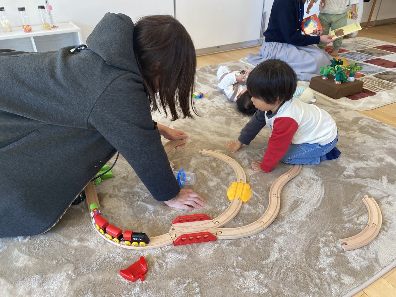 小さいお友だちは、一生懸命喃語でお話したり、おもちゃを握ったりしながらじっくり遊ぶ姿が見られていました。