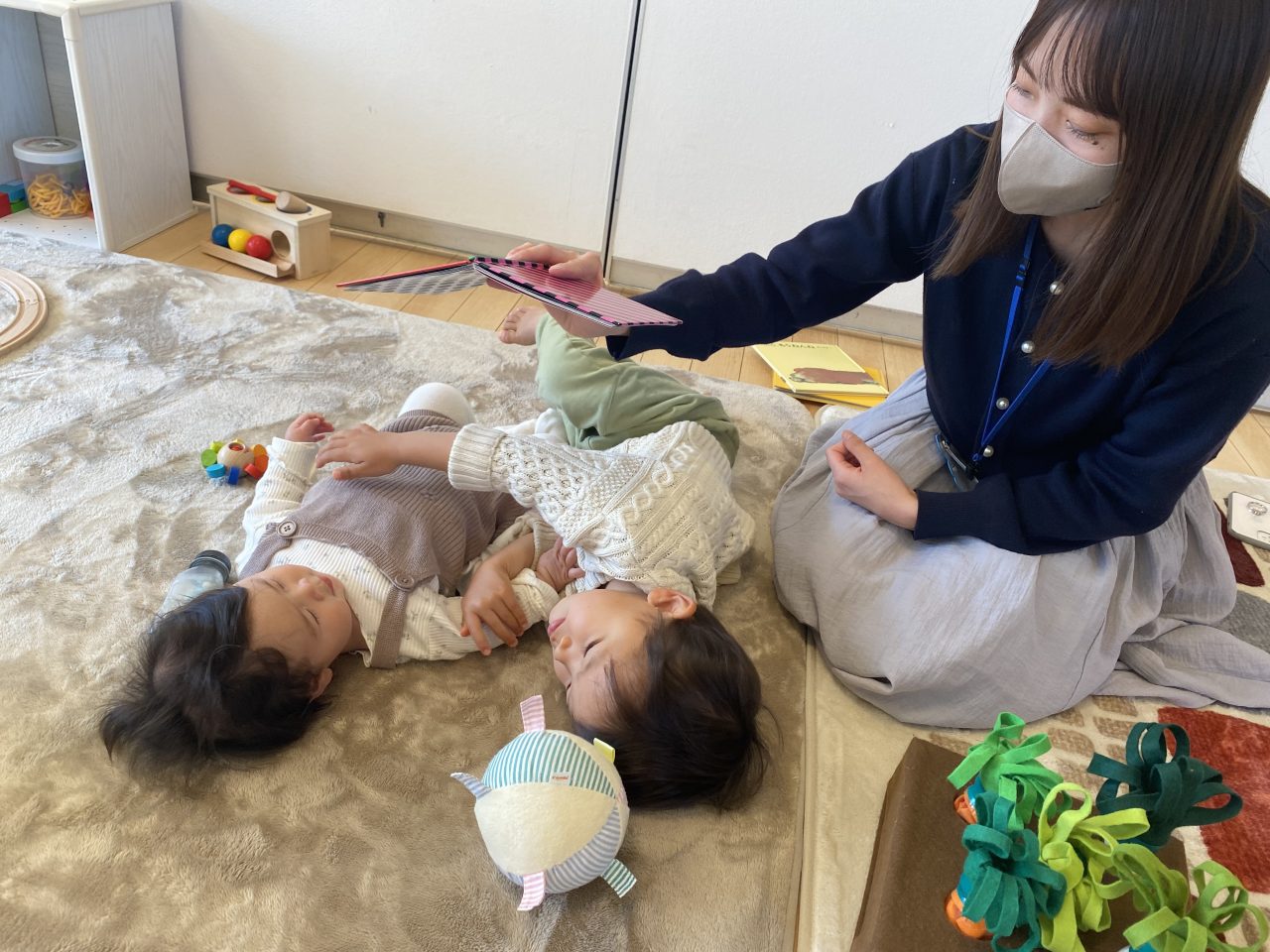じっくり遊んだ後は、みんなでお歌と手遊びを楽しみました。