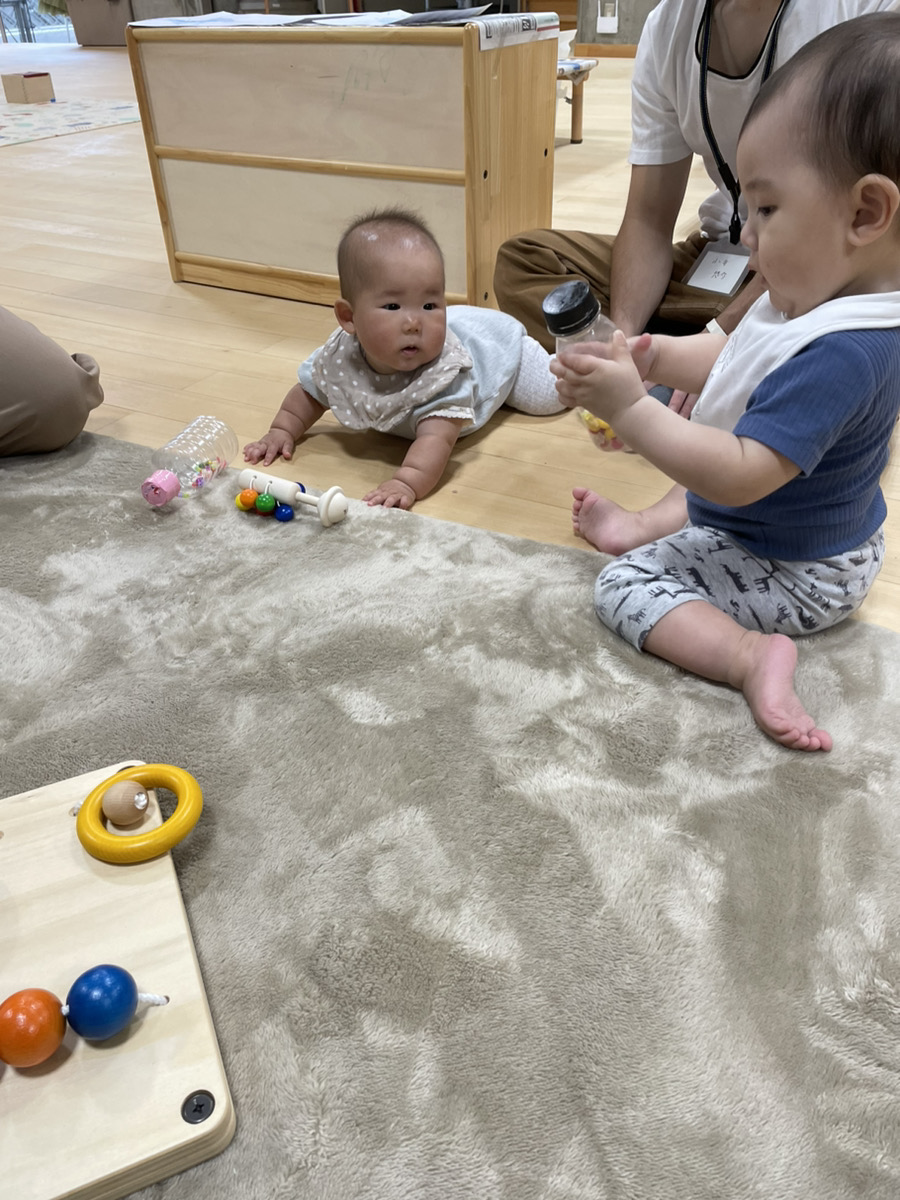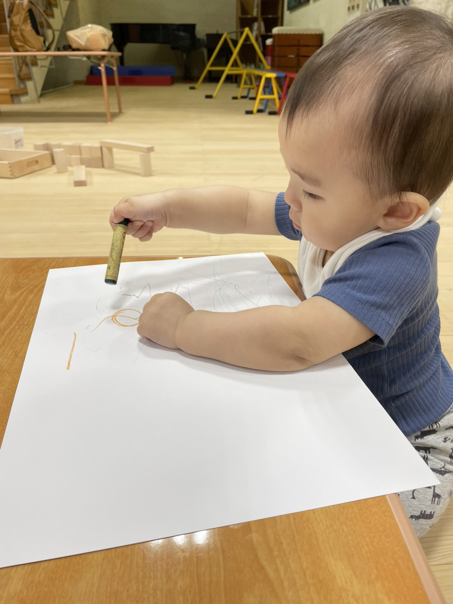 他にも、しっかりとクレパスを握ってお絵描きをしたり、自分で絵本を眺めてみたりと、興味のある遊びを見つけて、お家の人やお友だちと一緒に楽しんでいました。