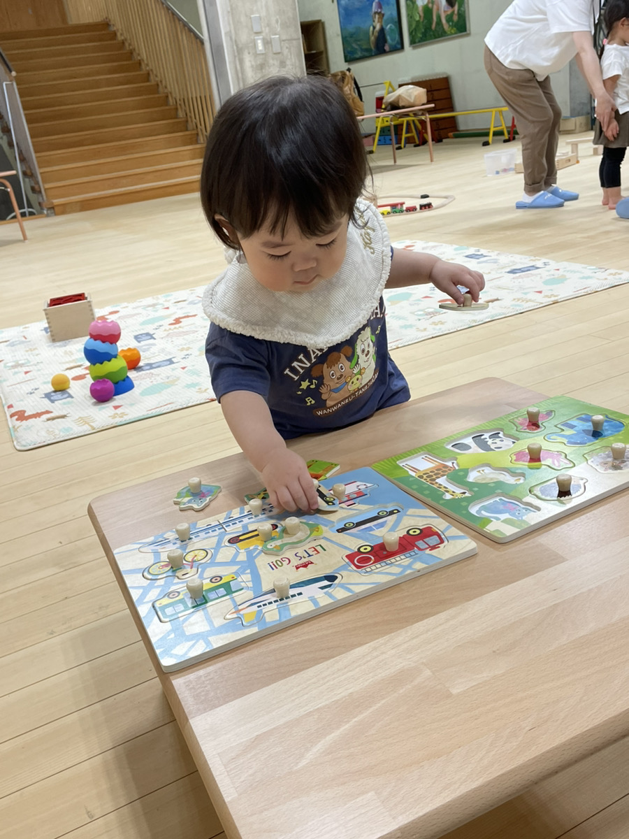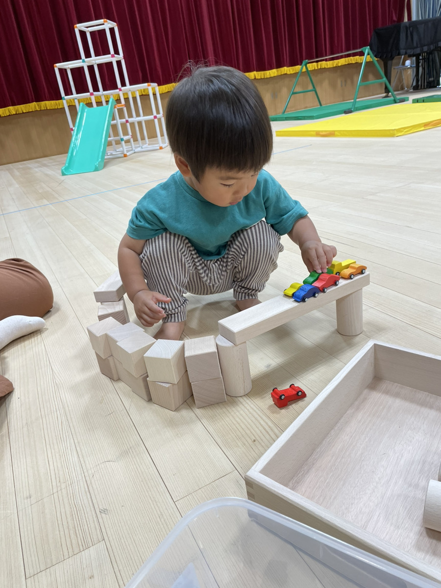 遊びでは、積み木で道を作って車を走らせたり、パズルをしたりする姿もありました。真剣な表情で、幅の細い積み木の上に上手に縦列駐車をしている姿も♪